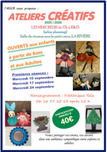 vous propose des ateliers créatifs le mercredi de 17h à 19h15 à la salle de réunion sous le Petit Creux.